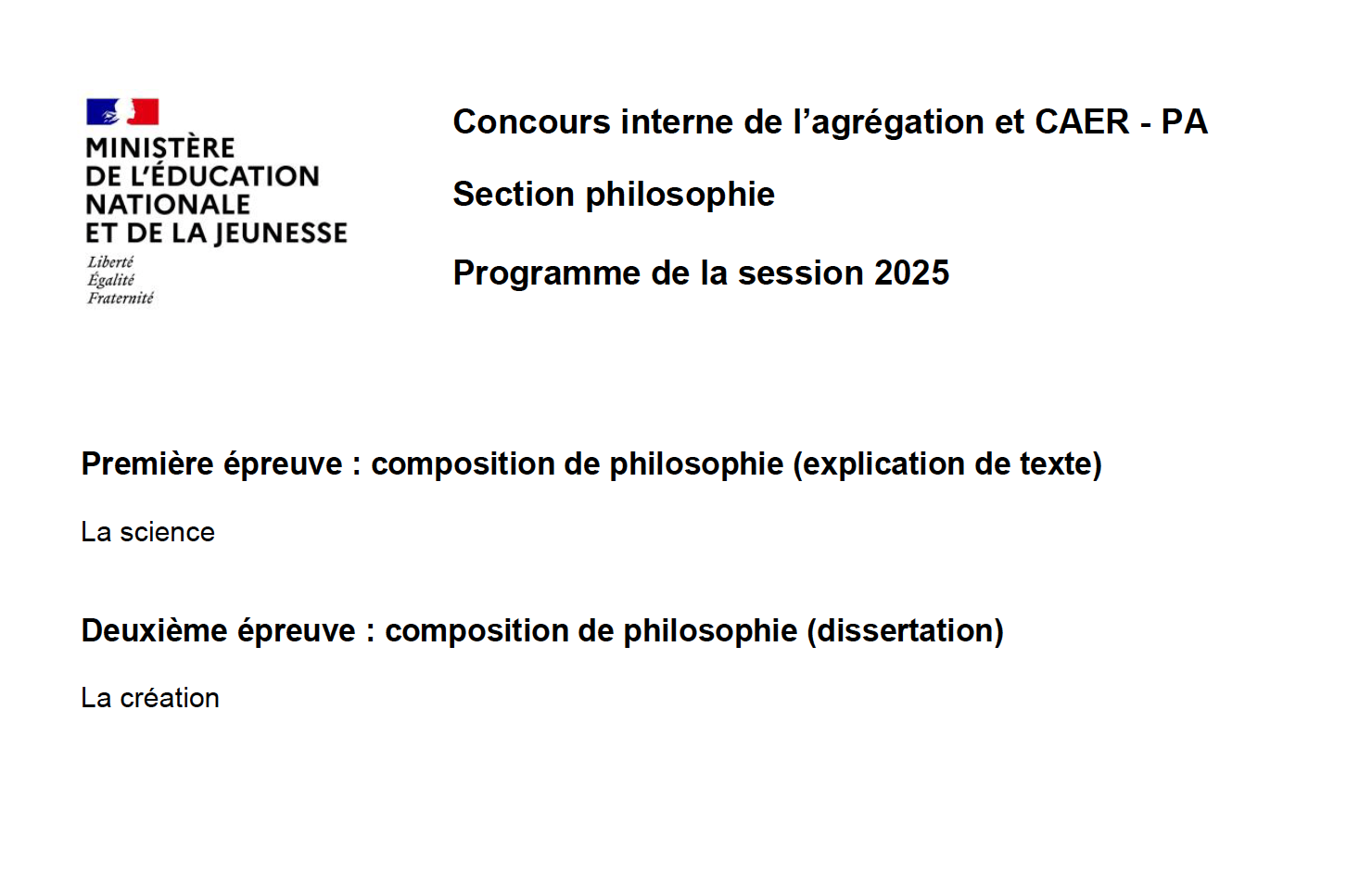 – Première épreuve : composition de philosophie (explication de texte) La science – Deuxième épreuve : composition de philosophie (dissertation) La création